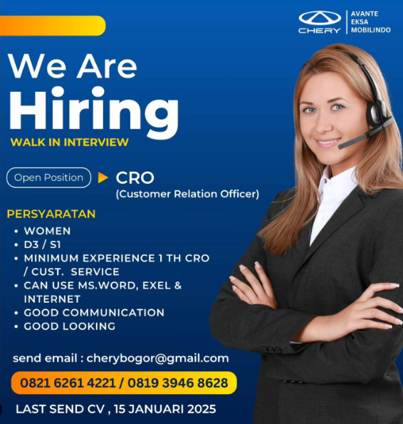 Dibutuhkan Segera: Marketing Executive di Dealer Chery Bogor (PT Avante Eksa Mobilindo) Kirim CV ke wa : 0877-3999-2215 (Attn. Ibu Yuni)